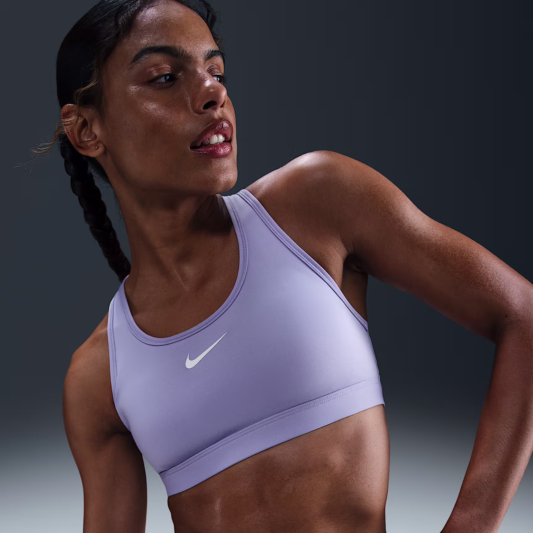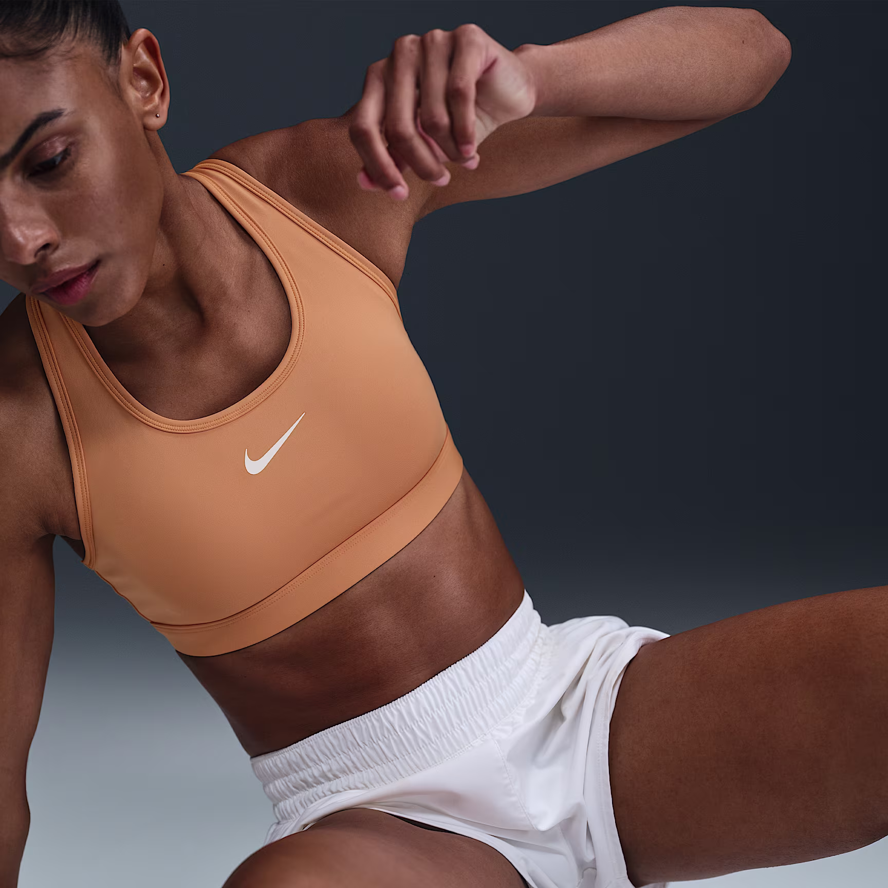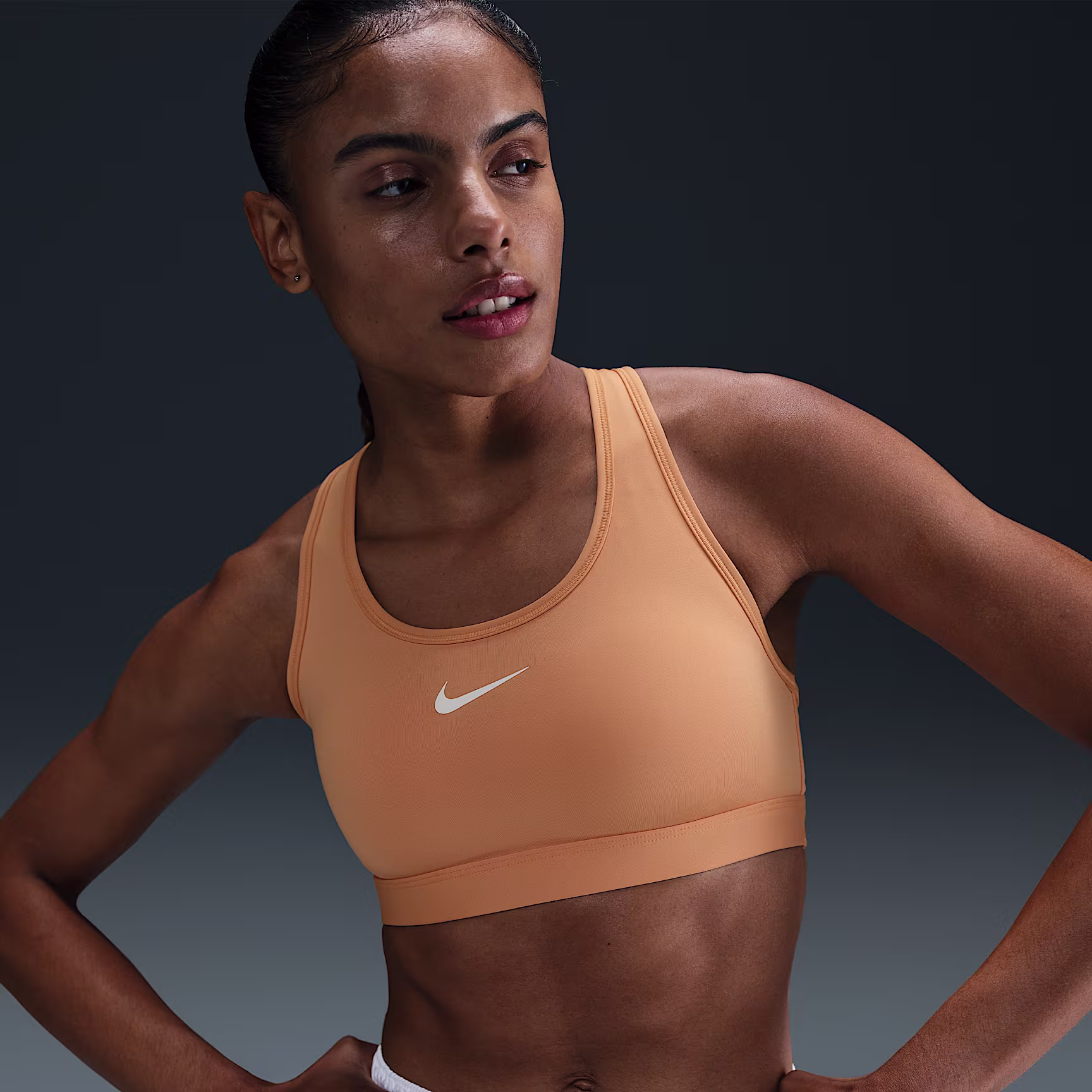 You're on the move. Your padding shouldn't be. This Swoosh bra's sewn-in pads stay in place so you can work hard without worrying about them shifting or folding. Great for training workouts and dance classes, medium support gives you a snug hold that helps keep everything in place. Plus, the sweat-wicking, adaptive material quickly recovers its shape so you can stay comfortable throughout your workout.